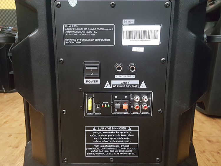- Mặt sau của là các cổng kết nối với jack 3.5, cổng đấu bình với nguồn điện 12V, cầu chì và công tắc nguồn của loa.
