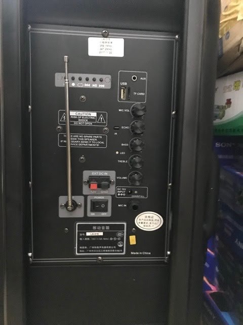 Bảng điều chỉnh âm thanh ở phía sau gồm các nút chức năng như Mic. Vol, Echo Mic, Bass nhạc, Tress nhạc, Volume nhạc, khe cắm USB, thẻ nhớ...Admin chụp ảnh thật để các bạn có cái nhìn chân thật nhất về sản phẩm.