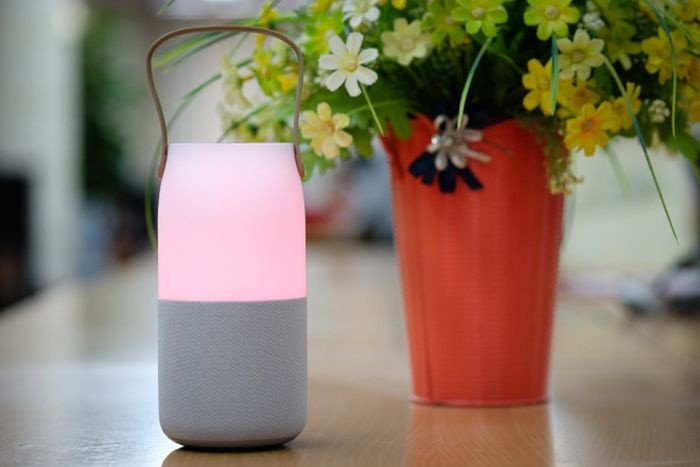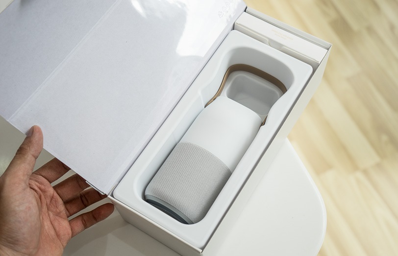 – Ngay từ cái nhìn đầu tiên, loa đổi màu của Samsung đã khiến không ít người thích thú với kiểu dáng không khác gì một cái chai nhưng quyến rũ hơn nhờ vào những đường nét bo cong – vuốt thẳng dứt khoát. Loa được thiết kế bên trên bằng nhựa màu trắng sữa và phần dưới bằng vải nỉ có màu xám. Tạo nên sự hài hòa trong tổng quan thiết kế.