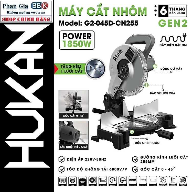 [LOẠI 1] Máy cắt nhôm HUKAN 255mm Chạy trực tiếp , Công suất 1850W, Bảo hành 1 năm, 100% dây đồng