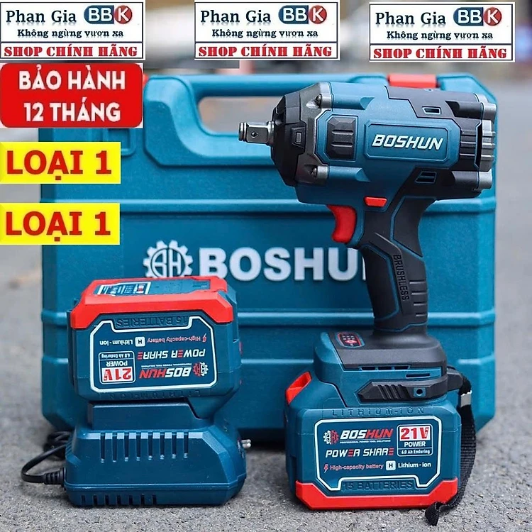 [LOẠI 1] Máy siết bulong pin Boshun Lực siết 850Nm, Động cơ Không chổi than, Ruột Đồng 100%, Pin 15Cell