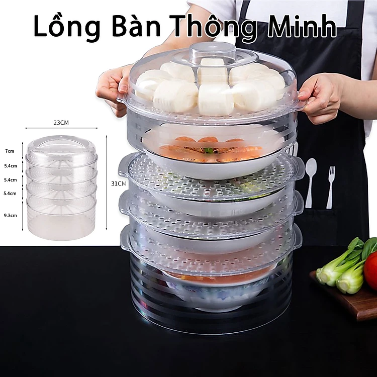 - Mặt thân thấp và thân cao có thiết kế các lỗ hở chạy theo thân tròn của sản phẩm giúp hơi nóng lan toả dọc thân lồng bàn khi xếp tầng từ dưới lên trên nắp
