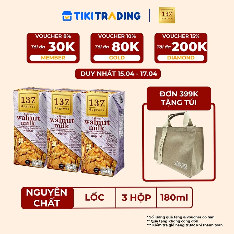 Lốc 3 hộp Sữa hạt Óc chó Nguyên chất 137 DEGREES 180ml - ĐƠN 399K TẶNG TÚI