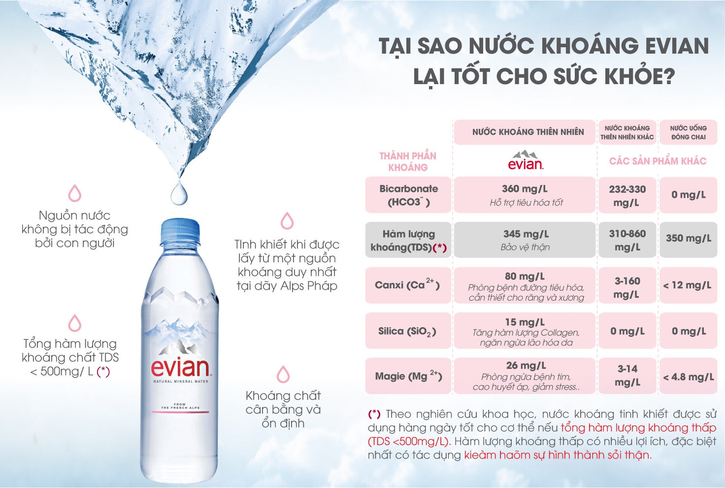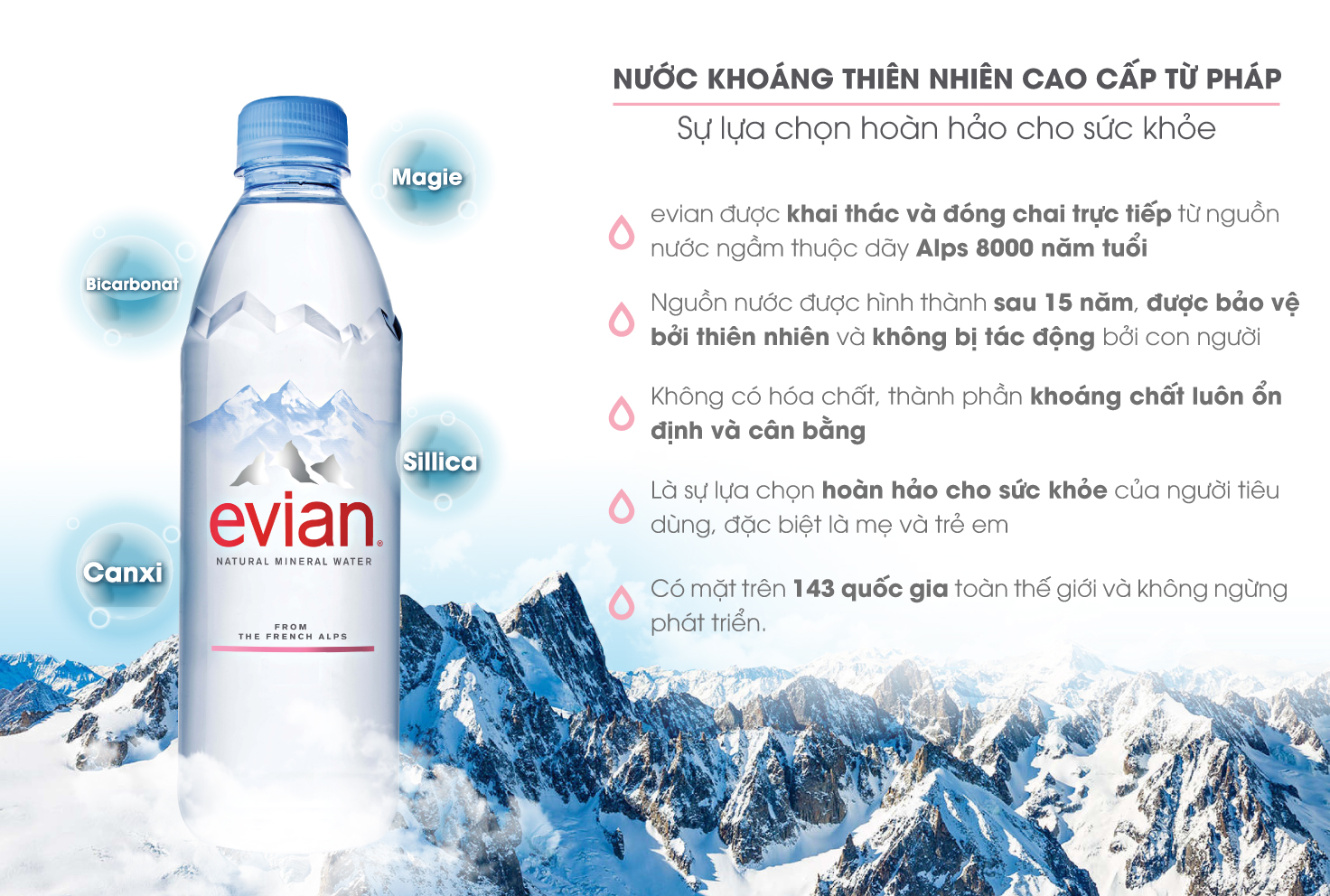 - Nước khoáng Evian là sự lựa chọn hoàn hảo cho sức khỏe của người tiêu dùng, đặc biệt là mẹ và bé.