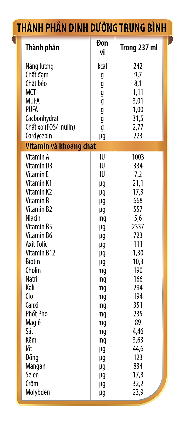 MCT là chất béo mạch trung bình được hấp thu, chuyển hóa nhanh thành năng lượng cho cơ thể. Bifidobacterium Lactis là hệ vi sinh vật lợi khuẩn trong đường ruột giúp bảo vệ hệ tiêu hóa khỏe mạnh tăng khả năng hấp thu dưỡng chất. FOS/ Inulin: Hỗ trợ đường ruột khỏe mạnh, duy trì nhu động ruột, ngăn ngừa táo bón hiệu quả.