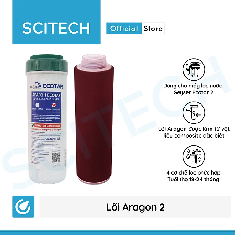 Lõi Aragon 2 Geyser (nhập khẩu Nga) được làm bằng vật liệu composite ép thành một khối độc lập, có tác động phức hợp tạo ra sự lọc vi cầu (kết cấu gồm các hạt dạng cầu cực nhỏ xếp sát nhau). Lõi Aragon với 4 cơ chế lọc gồm cơ học, trao đổi ion, hấp phụ và diệt khuẩn có khả năng loại bỏ các chất bẩn, clo, kim loại nặng trong nước, làm mềm nước cứng, giúp cân bằng pH, loại bỏ mùi, các chất hữu cơ, vi khuẩn, vi rút…