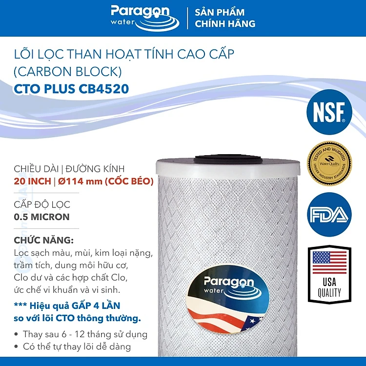 Lõi Lọc Carbon Block 20 inch Cốc Béo PARAGON CB4520 CTO Cao Cấp Than Hoạt Tính Dạng Khối - Hàng Chính Hãng
