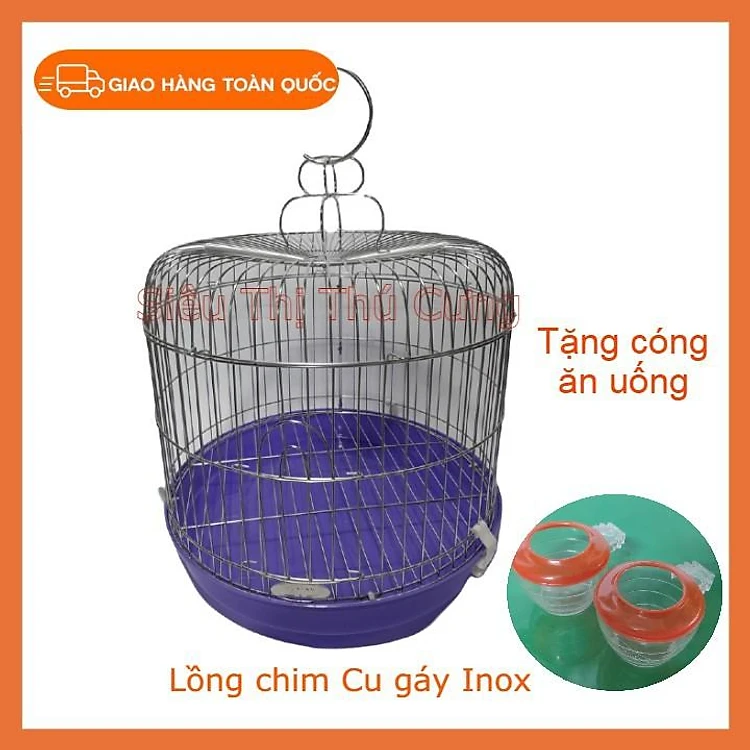 Lồng cu gáy Inox - Lồng nuôi chim cu gáy hình tròn khay nhựa - Tặng ngay 2 cóng ăn uống