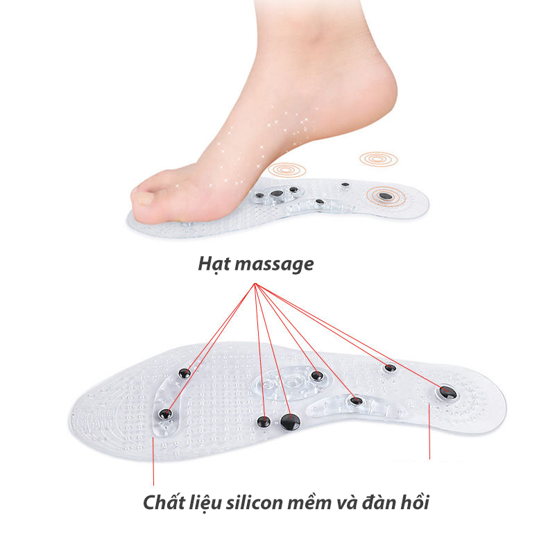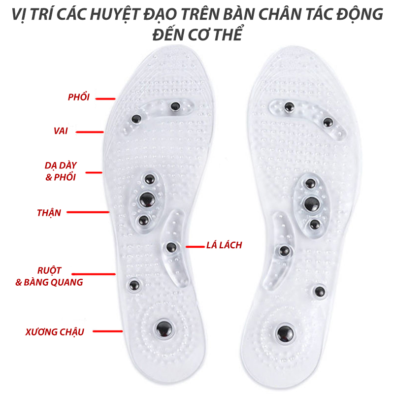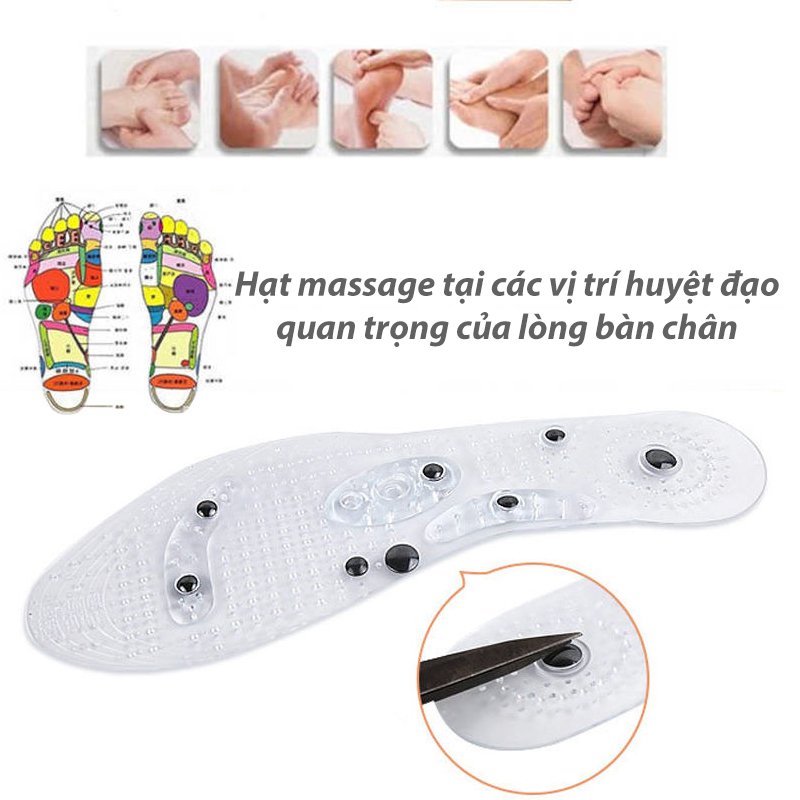 - Chi tiết: lót giày massage chân được đúc từ silicon mềm. Bề mặt gồm các hạt nổi nhỏ và các lỗ thoáng khí đều khắp mặt lót. Miếng lót được thiết kế các khối nổi với các hạt nam châm tại các vị trí tương ứng với các huyệt đạo liên kết với các cơ quan nội tạng trong cơ thể có tác dụng massage đem đến cảm giác dễ chịu cho cơ thể. CÁC HẠT NAM CHÂM CÓ THỂ THÁO RỜI để vệ sinh miếng lót khi cần thiết. Nếu không thích sử dụng hạt nam châm thì có thể tháo bỏ và chỉ sử dụng miếng lót vẫn đem lại cảm giác thư giãn cho bàn chân.