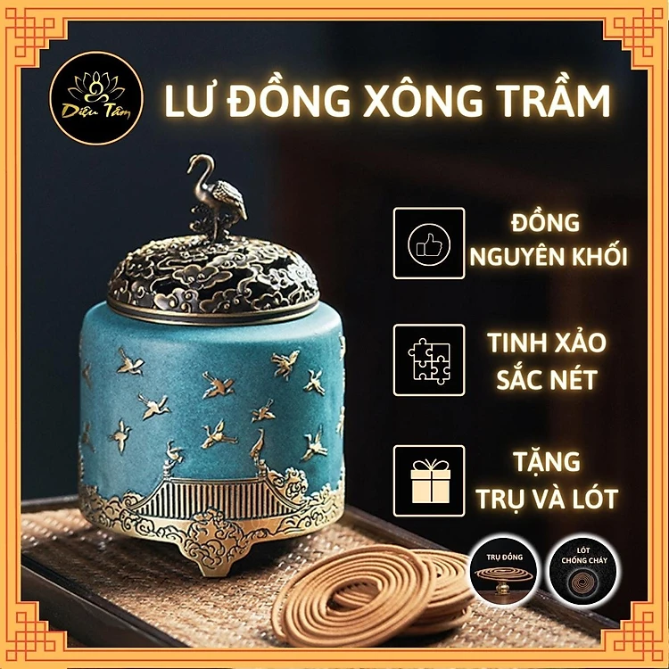 Sản phẩm :Lư đồng xông trầm, lư xông trầm dùng để xông trầm hương thay cho thác khói trầm có hộp làm quà tặng sang trọng lư hạc xanh shop Diệu Tâm