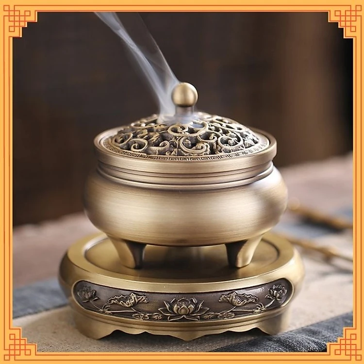 Lư đồng xông trầm nắp chọn mẫu kèm đế đôn đồng tặng trụ cắm hương