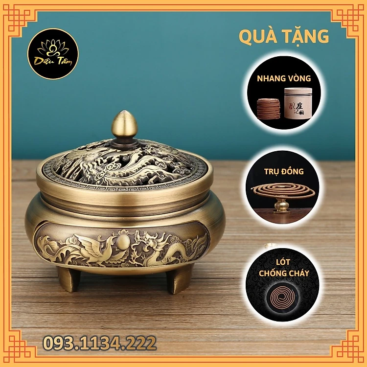 Lư xông Trầm hương chất liệu đồng nguyên khối khắc rồng phượng - chọn mẫu đôn , đế lư đồng thay lư điện Tặng trụ cắm