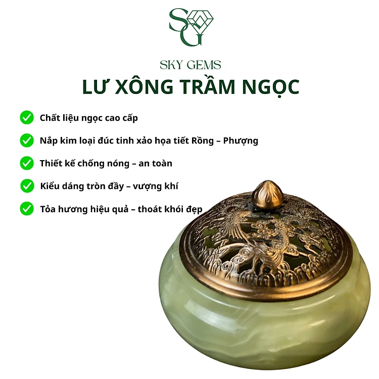 Lư Xông Trầm Ngọc Onyx Xanh và Trắng – Cao 7cm, Đường Kính 10cm – Khói Đẹp, Bền, Sang Trọng