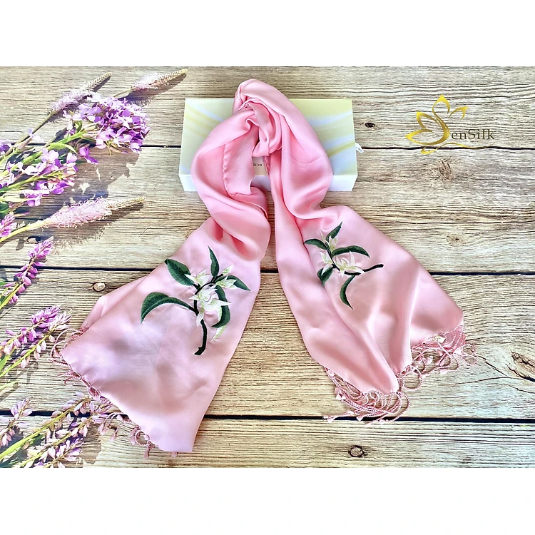 Lụa Tơ Tằm Bảo Lộc Thêu Tay Hoa Ngọc Lan 200x55cm SenSilk, Quà Việt Nam, Hand Embroidery Silk