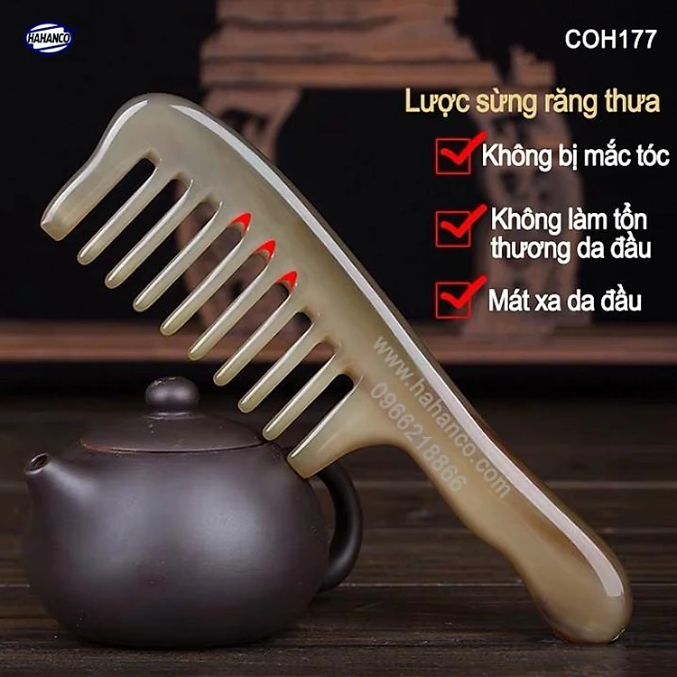 Đây là mẫu lược sừng trơn răng thưa, có thể mát xa đầu và dùng cho tất cả các loại tóc, tóc xù, xoăn, rối,