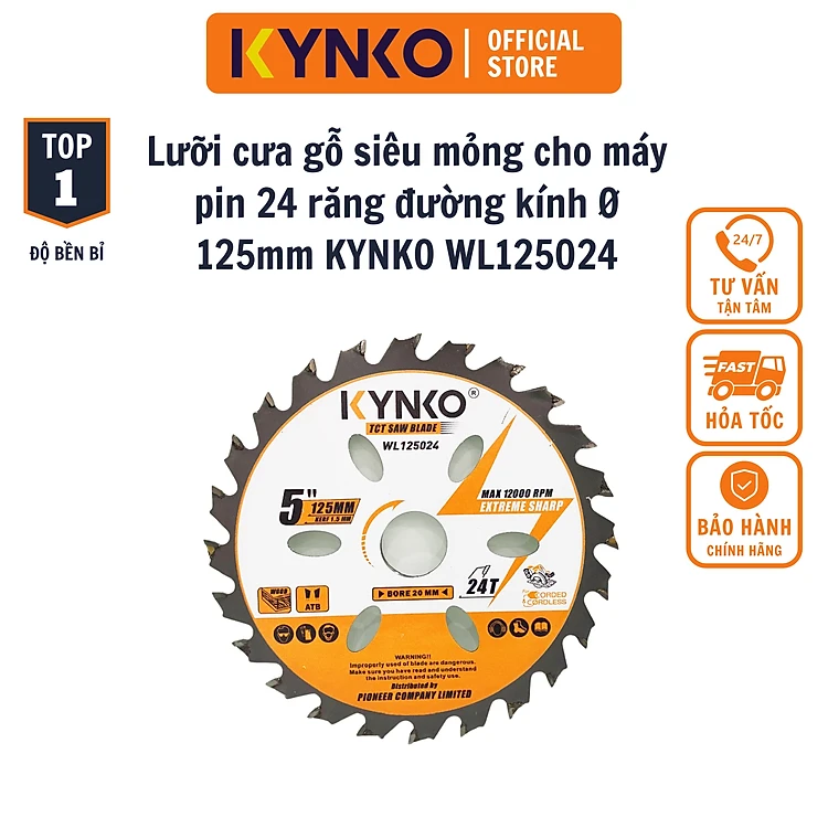 Lưỡi cưa gỗ siêu mỏng cho máy pin 24 răng đường kính Ø 125mm KYNKO WL125024