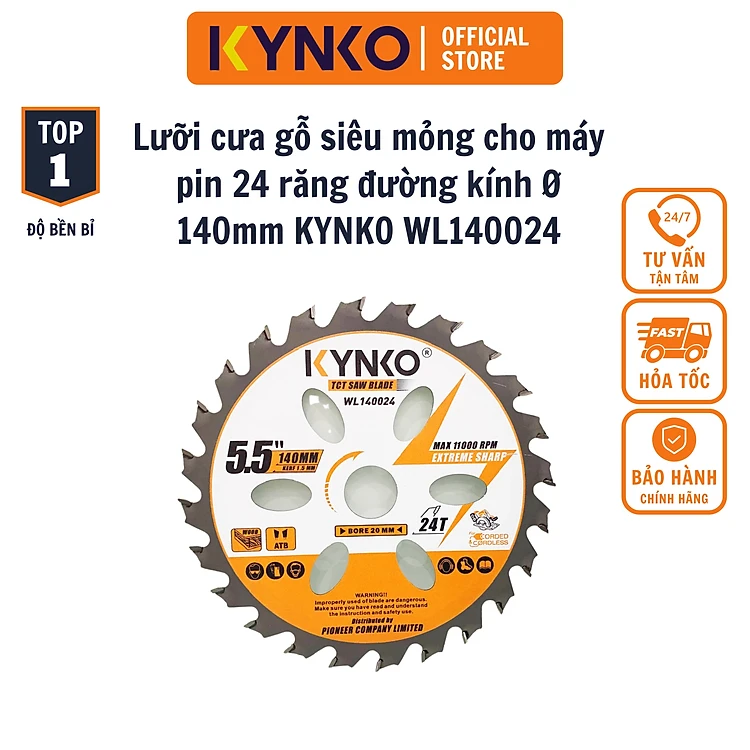 Lưỡi cưa gỗ siêu mỏng cho máy pin 24 răng đường kính Ø 140mm KYNKO WL140024