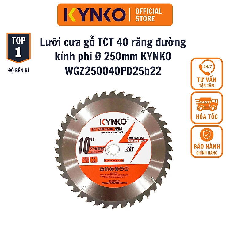 LƯỠI CƯA GỖ TCT 40 RĂNG đường kính phi Ø 250mm KYNKO WGZ250040PD25b22