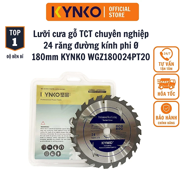 LƯỠI CƯA GỖ TCT CHUYÊN NGHIỆP 24 RĂNG đường kính phi Ø 180mm KYNKO WGZ180024PT20
