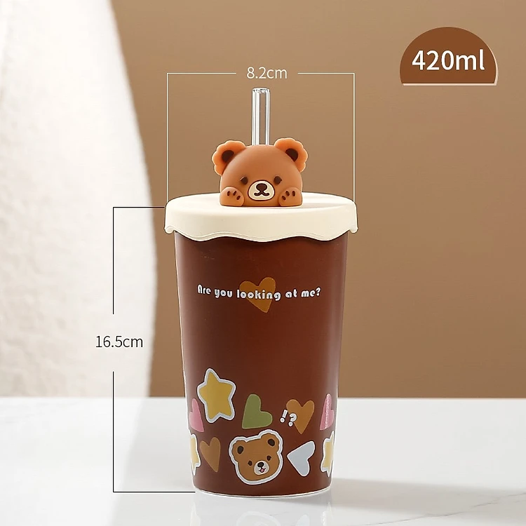 Ly gốm sứ dáng cao đầu gấu kèm nắp silicon dễ thương 420ml