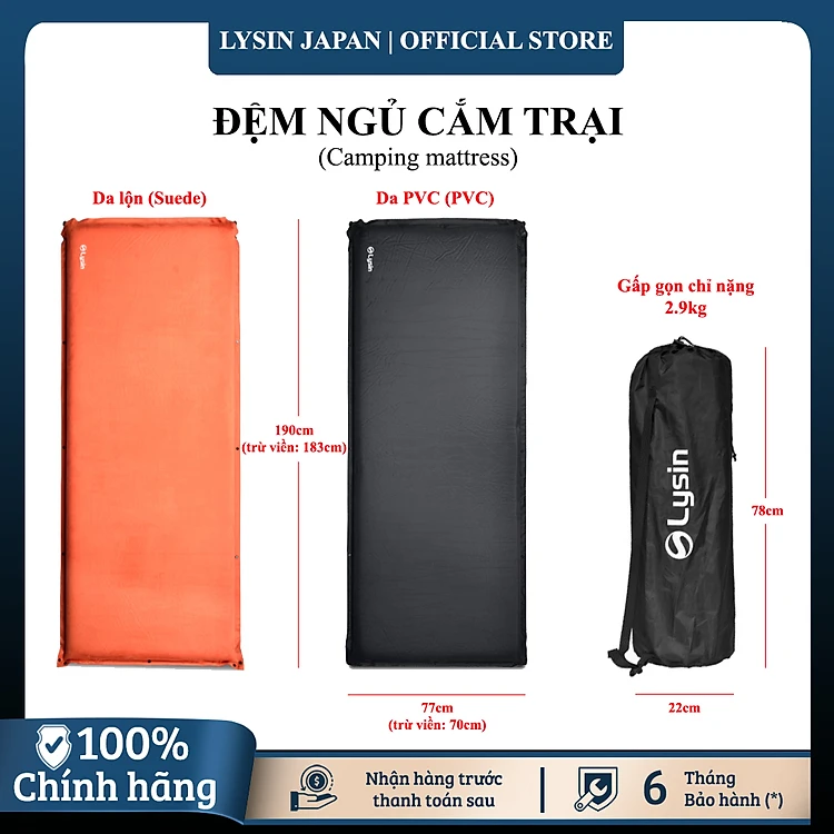 Lysin - đệm nằm dã ngoại (roonjgcm dày 8cm, chất liệu da lộn) tự bơm hơi thoảng mái chống thấm nước cắm trại ngoài trời, picnic du lịch camping có thể liên kết với nhau