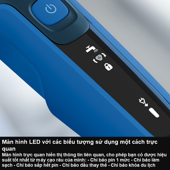 - Máy cạo râu Philips S5466 có màn hình hiển thị LED giúp bạn nhận biết dung lượng pin, đang sạc pin. Nhận biết chế độ làm sạch, đầu cạo và khóa du lịch.
