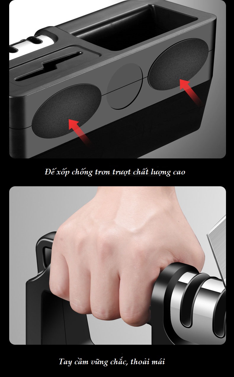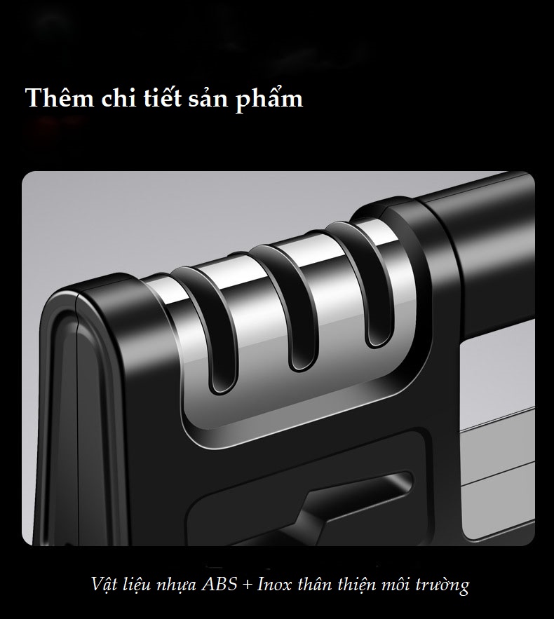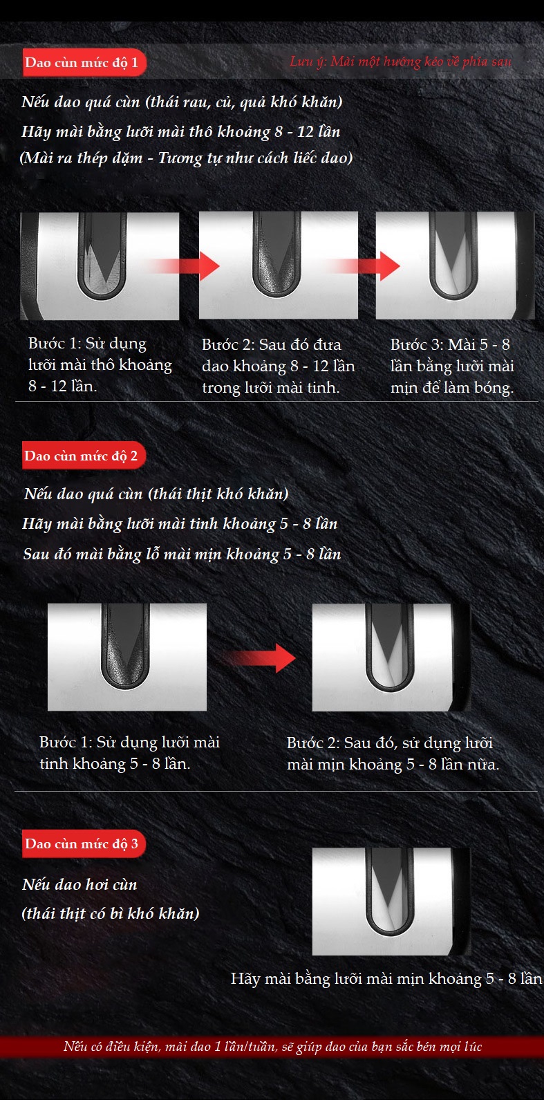 - [Ba bước mài nâng cấp] - Như các bạn đã biết, để có một chiếc dao sắc bén hoàn hảo đến từng góc cạnh, bạn phải mài qua rất nhiều bước và phải mài rất kỹ. Vì thế mà mài dao này đã được nhà sản xuất nâng cấp với 3 lưỡi mài riêng biệt tương ứng với từng chức năng của nó. Trong đó, lưỡi mài thô làm từ chất liệu thép vonfram, dùng để liếc những chiếc dao cũ và phục hồi những lưỡi dao quá cùn hay bị mẻ. Lưỡi mài tinh sử dụng đá mài kim cương, để mài các loại dao thường, dao hơi có dấu hiệu cùn. Cuối cùng, lưỡi mài mịn với chất liệu là gốm hàng không, có tác dụng làm mịn, làm bóng, giúp lưỡi dao sáng loáng.