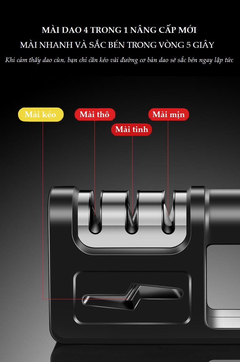 - [Mài dao 4 trong 1] - Mài dao đa năng 4 trong 1 kiểu mới được nâng cấp lên đến 4 mức mài đó là, mài kéo, mài thô (liếc dao), mài tinh và mài mịn. Trong đó, lưỡi mài kéo được thiết kế riêng, tiện cho nhu cầu mài những chiếc kéo đã bị cùn, mòn của gia đình.