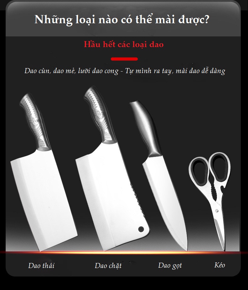 - [Có thể mài được hầu hết các loại dao] - Mài dao được thiết kế để mài được hầu hết các loại dao và kéo như dao chặt, dao thái, dao gọt hoa quả, dao lóc xương… những loại dao lưỡi cùn, cong vênh hay sứt mẻ.