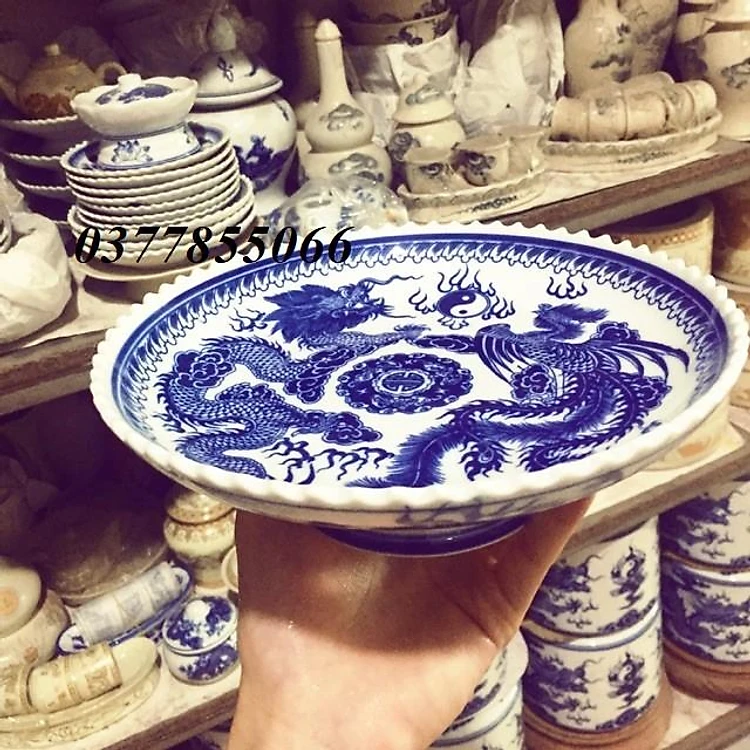 Mâm bồng, đĩa ngủ quả để bàn thờ tổ tiên sứ men xanh Bát Tràng đẹp và sang trọng, kích thước từ 16-30cm