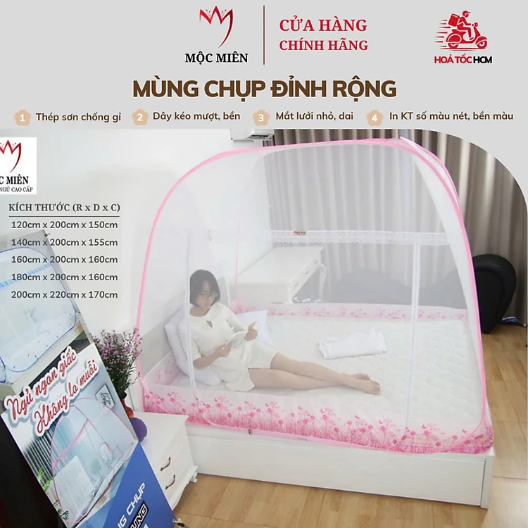Màn Chụp Tự Bung Đỉnh Rộng Có Viền Chân Mộc Miên - Trắng Viền Hồng