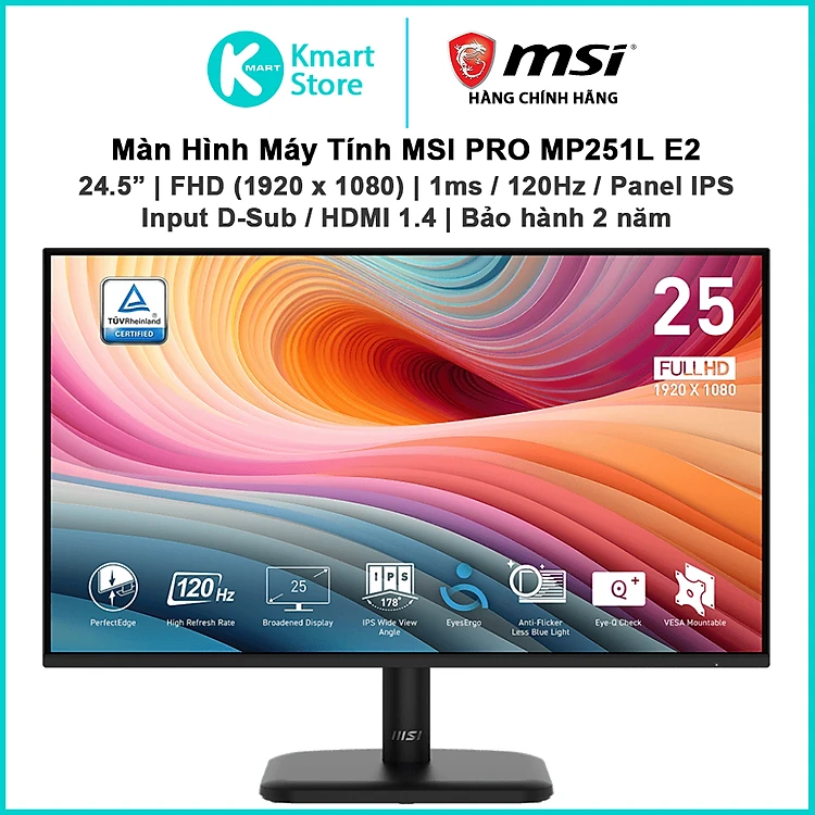 Màn hình máy tính MSI Pro MP251L E2 | 24.5" FHD 1920x1080 120Hz /1ms/IPS | HDMI/VGA | Bảo hành 2 năm | Hàng Chính Hãng
