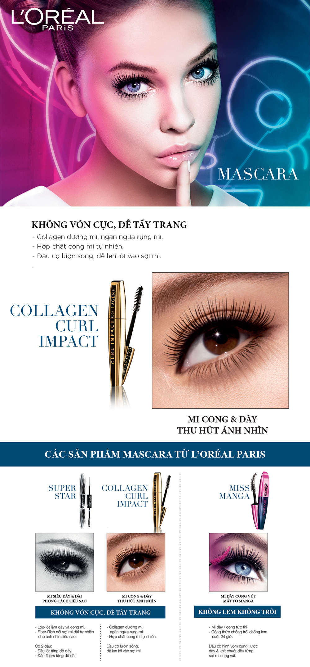 Trong hơn 10 năm qua, Mascara Maybelline luôn được yêu thích và đã chiếm thị phần số 1 tại Việt Nam (tất cả các kênh bán hàng*). Nay giới thiệu dòng mascara Maybelline Colossal Làm Dày Mi 10 Lần ứng dụng công nghệ mới với Collagen & đầu cọ đặc biệt cho mi dày hơn đến 10 lần. Sản phẩm giúp mi dày ấn tượng, ngay lập tức để bạn tự tin và cuốn hút hơn.
