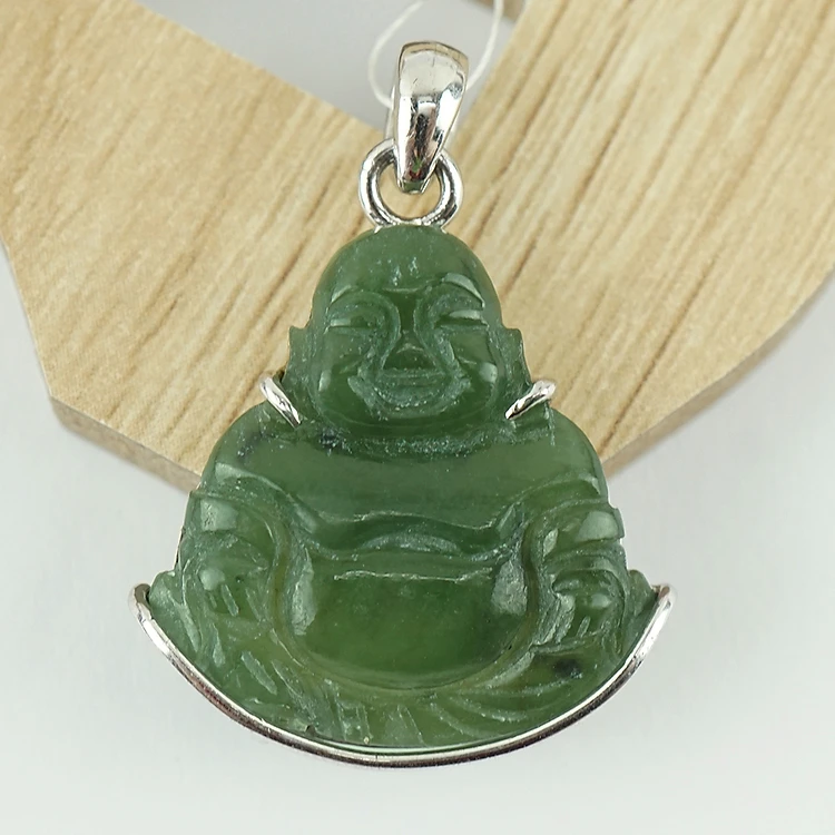 Mặt dây chuyền đá ngọc bích Nephrite Phật Di Lặc Khung Bạc