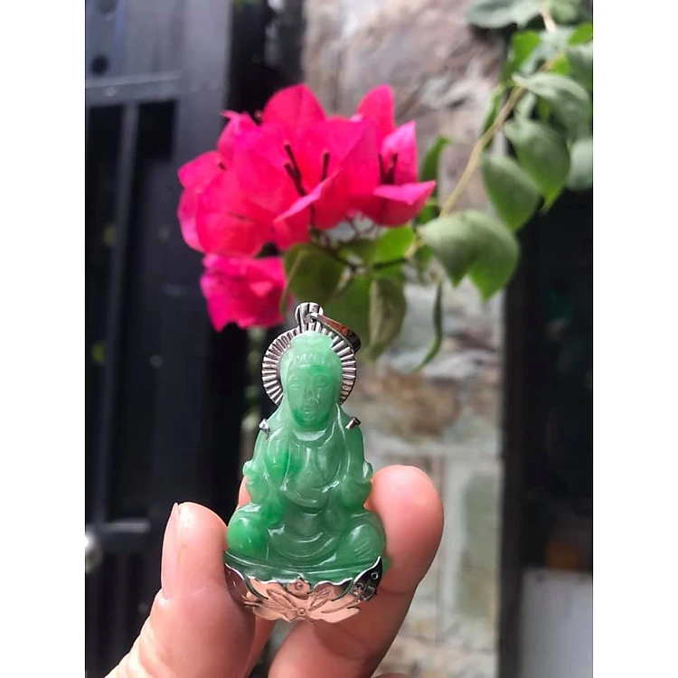 MẶT DÂY CHUYỀN NỮ PHẬT QUAN ÂM MÀU XANH NHẸ NHẸ BỌC INOX CHẤT LIỆU ĐÁ CẨM THẠCH TỰ NHIÊN ĐẸP Size Cao 48mm x Ngang 27mm x Dầy 7mm