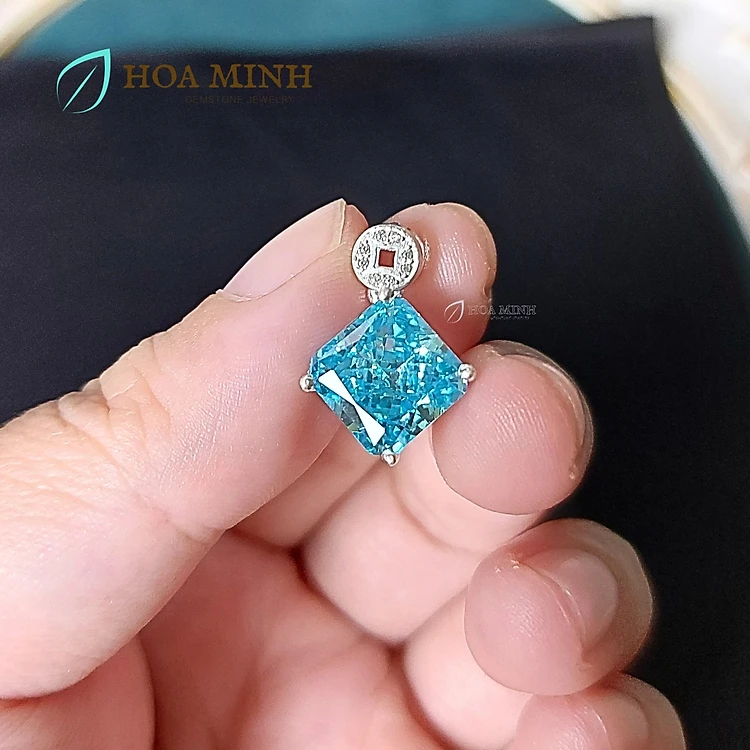 Mặt dây chuyền xoàn Nam Phi xanh biển aqua vuông size 10 li khoen kim tiền bạc nguyên chất