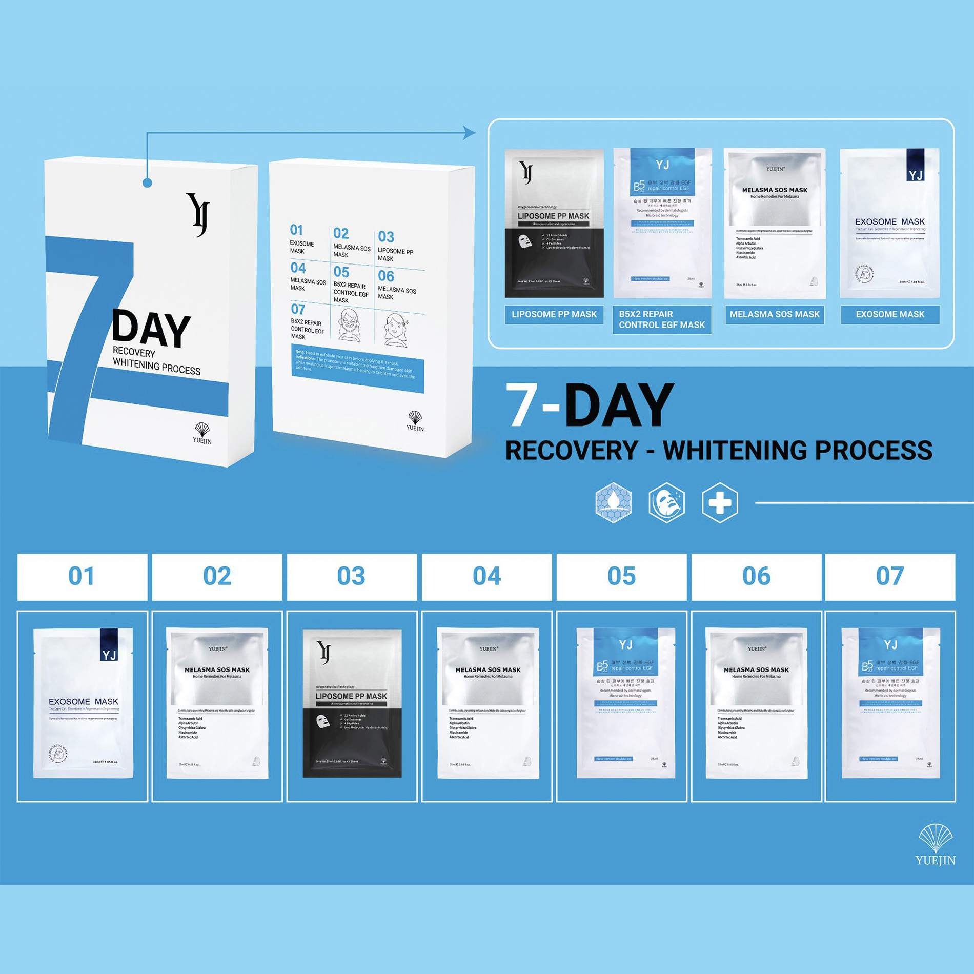 Bộ sản phẩm 7 ngày Yuejin với sự kết hợp hoàn hảo của 3 mặt nạ Melasma SOS sáng da, 2 mặt nạ phục hồi B5, 1 mặt nạ cấp ẩm Liposome và 1 mặt nạ tế bào gốc Exosome mang đến giải pháp toàn diện cho làn da, giúp phục hồi da nhanh chóng và dưỡng da trắng sáng rạng rỡ.