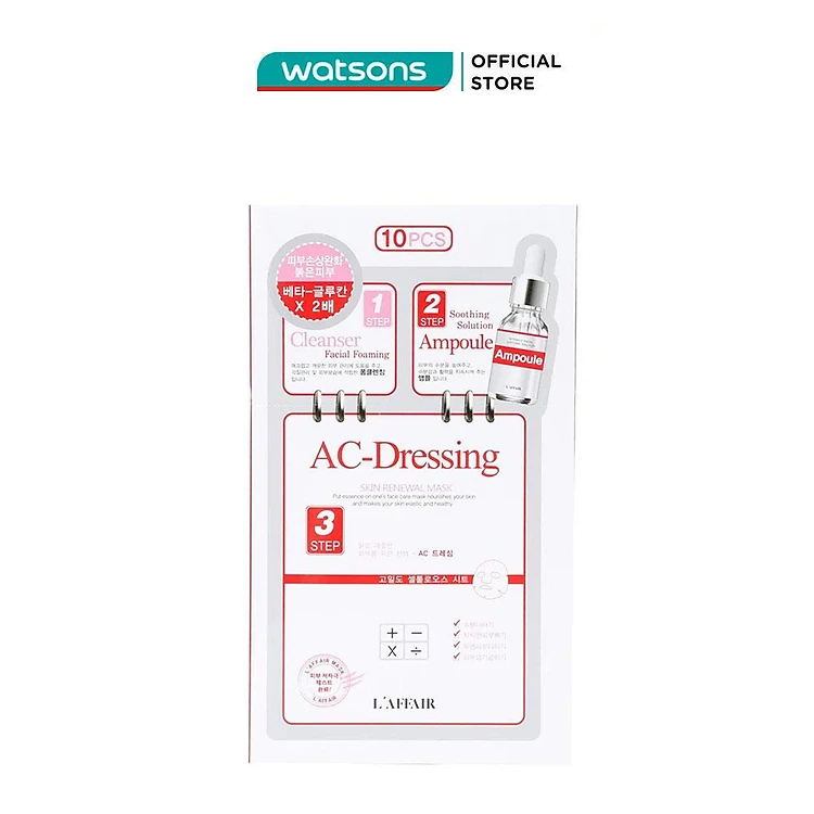 Mặt Nạ Dưỡng Da 3 Bước Rainbow L'Affair AC-Dressing Skin Renewal thuộc dòng sản phẩm kết hợp đầy đủ ba bước chăm sóc da chuyên sâu: Cleanser Làm sạch da, Ampolue Dưỡng chất cấp ẩm, Mask Pack Chăm sóc da. Mặt nạ cung cấp Axit Hyaluronic, khoáng chất phong phú và vitamin giúp cung cấp độ ẩm ngay lập tức cho da khô và thô ráp do ảnh hưởng của sự căng thẳng và ô nhiễm môi trường bên ngoài.