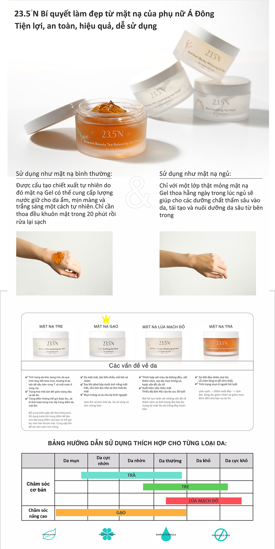 - Mặt Nạ Gel 23.5N Trắng Da Chiết Xuất Từ Hạt Gạo RSGM20 là dạng Gel và không có dầu, khi bôi lên trên da mặt, cảm giác nhẹ hơn mặt nạ giấy và mặt nạ bùn, thẩm thấu nhanh và không gây nhờn rít cho da.