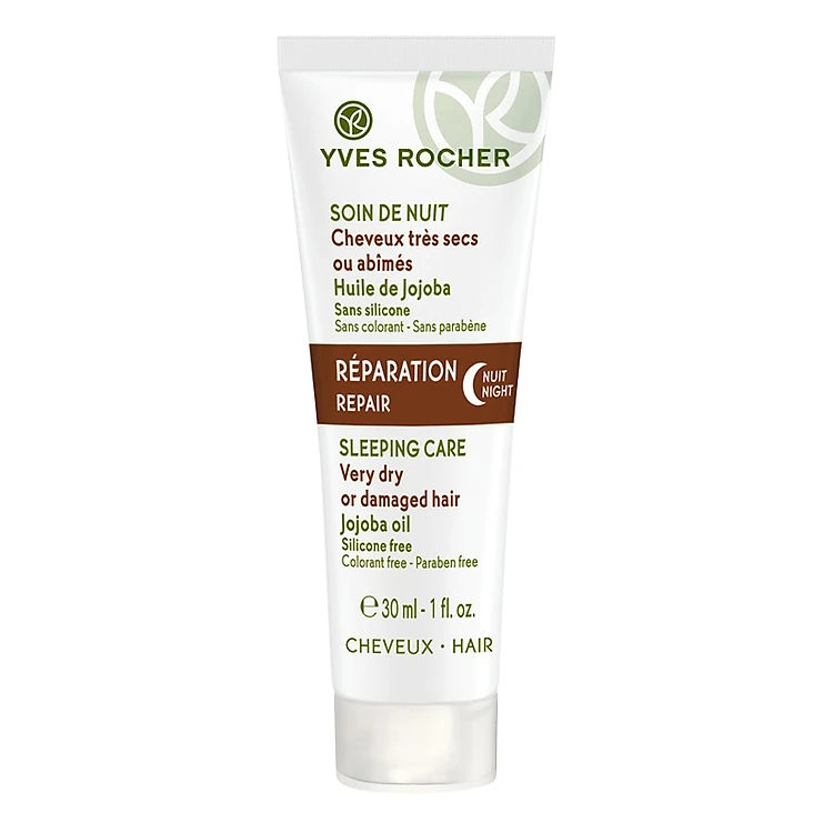 - Mặt Nạ Ngủ Phục Hồi Sức Sống Cho Tóc Khô Và Hư Tổn Yves Rocher Repair Night Sleeping Care Very Dry Or Damaged Hair 30ml với chiết xuất dầu Jojoba 100% từ thiên nhiên an toàn cho người sử dụng. Sản phẩm có kết cấu dạng kem không gây nhờn bết cho mái tóc hay để lại dấu vết trên gối.