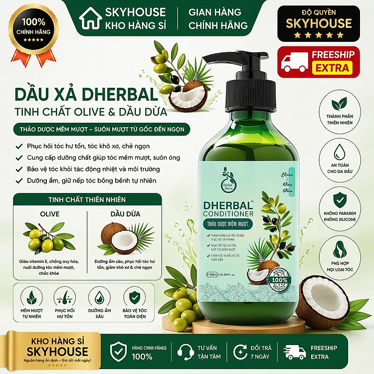 Dầu xả thảo dược thiên nhiên tinh chất olive dầu dừa độc quyền DHERBAL chai 300ml dầu xả tóc chắc khỏe suôn mượt chính hãng