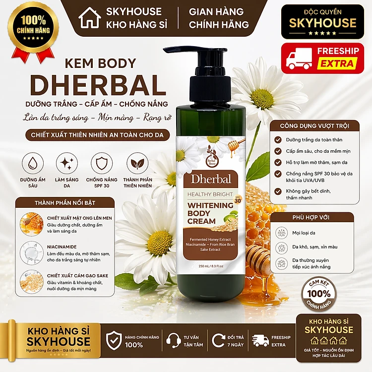 Kem dưỡng trắng da thiên nhiên độc quyền WHITENING BODY CREAM DHERBAL chai 250ml kem chống nắng toàn thân chính hãng