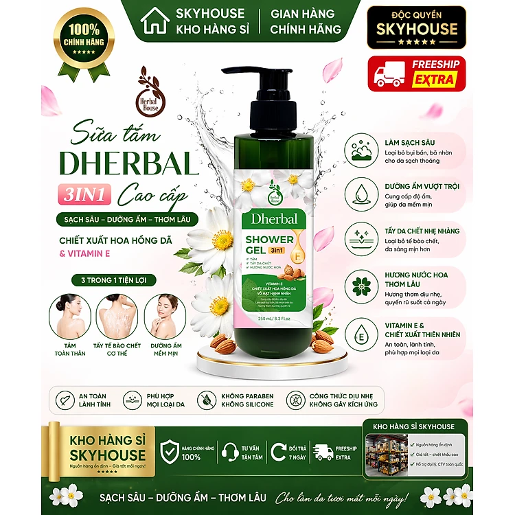 Sữa tắm trắng da 3in1 thiên nhiên độc quyền DHERBAL chai 250ml sữa tắm dưỡng ẩm thơm lâu chính hãng