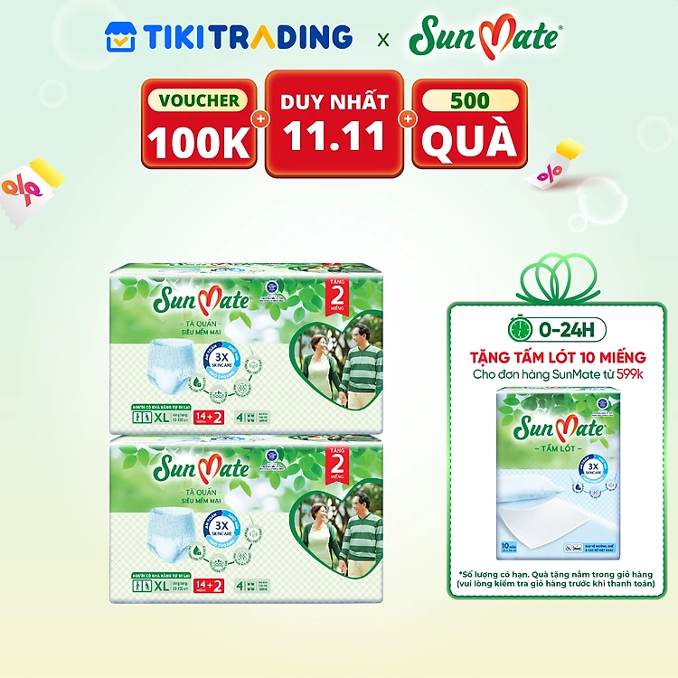 [Mẫu mới] Combo 2 Tã quần SunMate siêu mềm mại G1 mới size XL-14+2 miếng