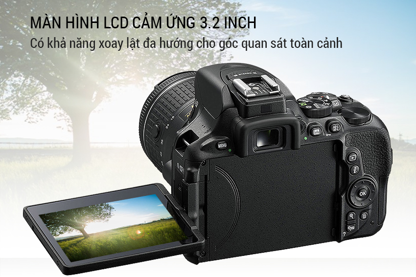 Máy Ảnh Nikon D5600 KIT AF-P 18-55 VR với ngoại hình khá gọn nhẹ, tiện dụng cho người dùng mới làm quen với dòng máy ảnh DSLR. Máy trang bị màn hình LCD 3.2 inch 1 triệu điểm ảnh có khả năng xoay lật đa hướng cho góc quan sát toàn cảnh. Màn hình cảm ứng cho khả năng thiết lập các thông số một cách dể dàng. Bên cạnh đó, máy còn được trang bị một viewfinder quang học có độ bao phủ 95% với độ phóng đại 0.82x.