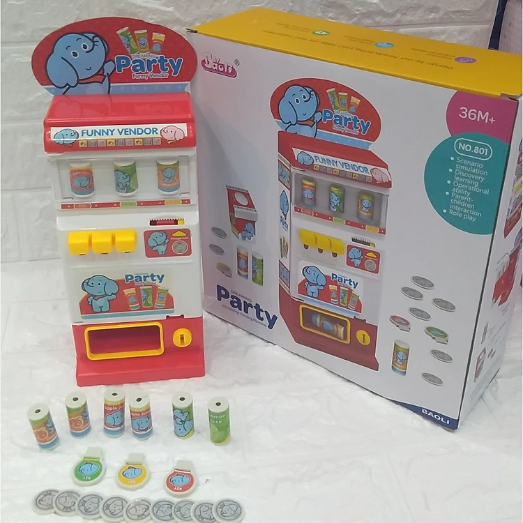 Bộ sản phẩm: 1 máy bán nước, 1 thùng rác, 9 đồng tiền, 3 chìa khóa, 6 lon nước ngọt