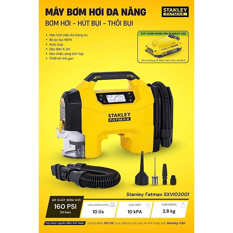 Máy bơm hơi đa năng dùng pin kèm tính năng thổi và hút bụi hiệu STANLEY Model SXVI02001A, 3 trong 1- hàng chính hãng