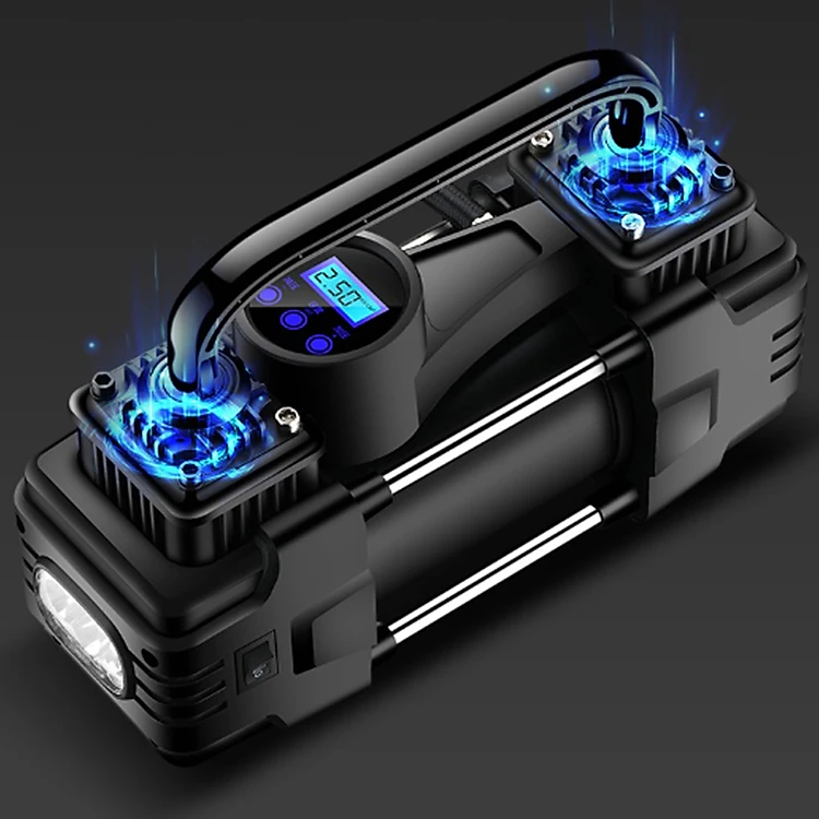 Máy bơm lốp ô tô 2 xi lanh đo hơi và điện áp bằng đồng hồ hiện thị màn hình LED công suất 220W sử dụng nguồn 12V, chiều dài dây nguồn 2,8m
