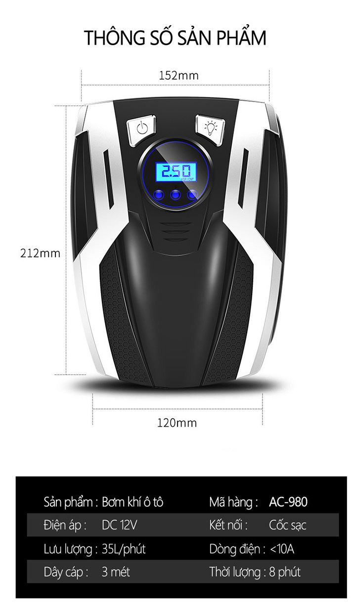 ► Bơm hoạt động bằng nguồn điện 12V lấy trực tiếp từ ổ sạc xe hơi, tiện lợi khi sử dụng. Thời gian bơm căng lốp xe khoảng 80 giây.