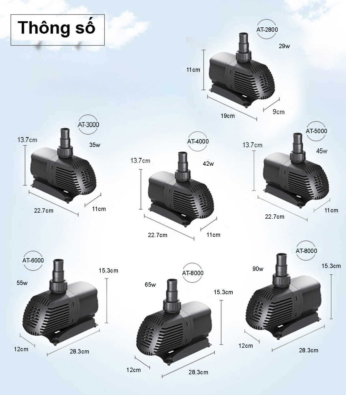 - Bơm đẩy thác, bơm lọc tràn dưới, bơm tạo oxy.